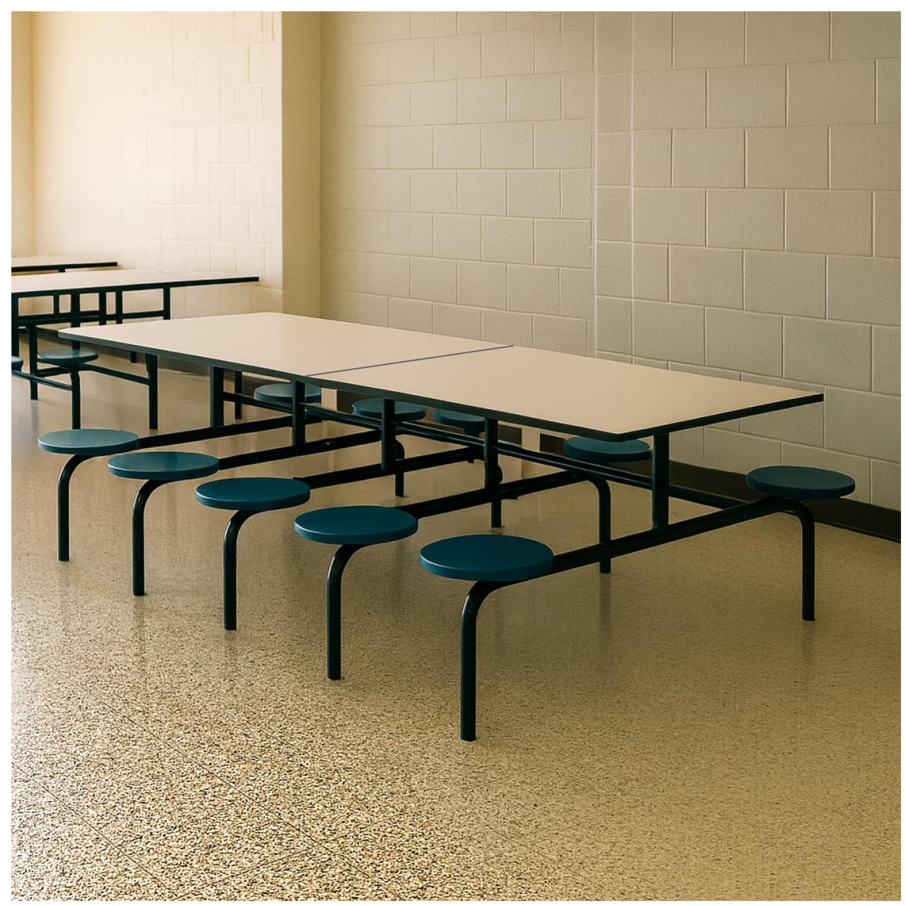 Mesa coletiva de refeitório com bancos fixos integrados, ideal para uso em ambientes institucionais, industriais, escolares e corporativos. Estrutura metálica reforçada e assentos individuais acoplados garantem durabilidade, praticidade e organização do espaço.