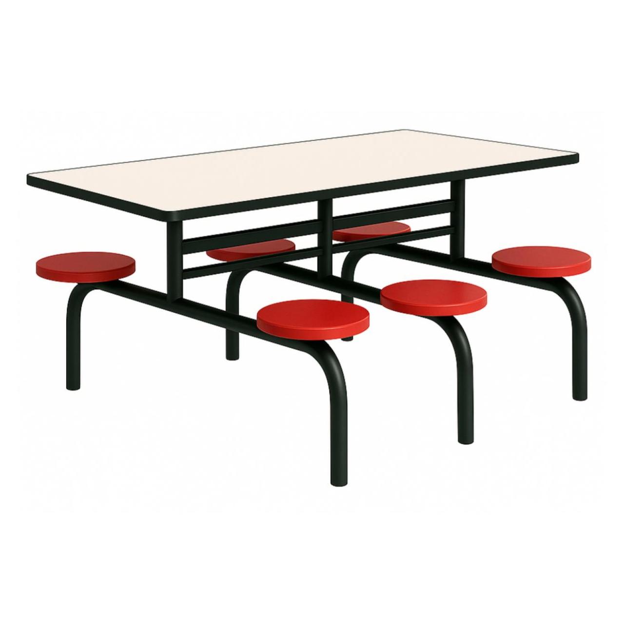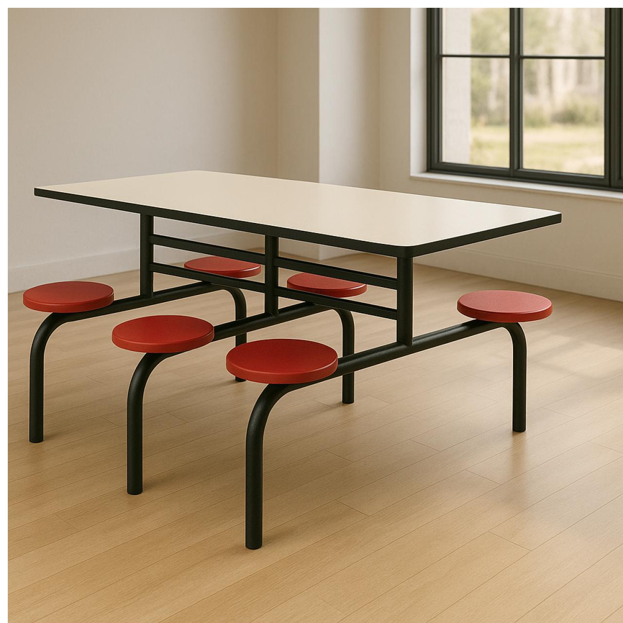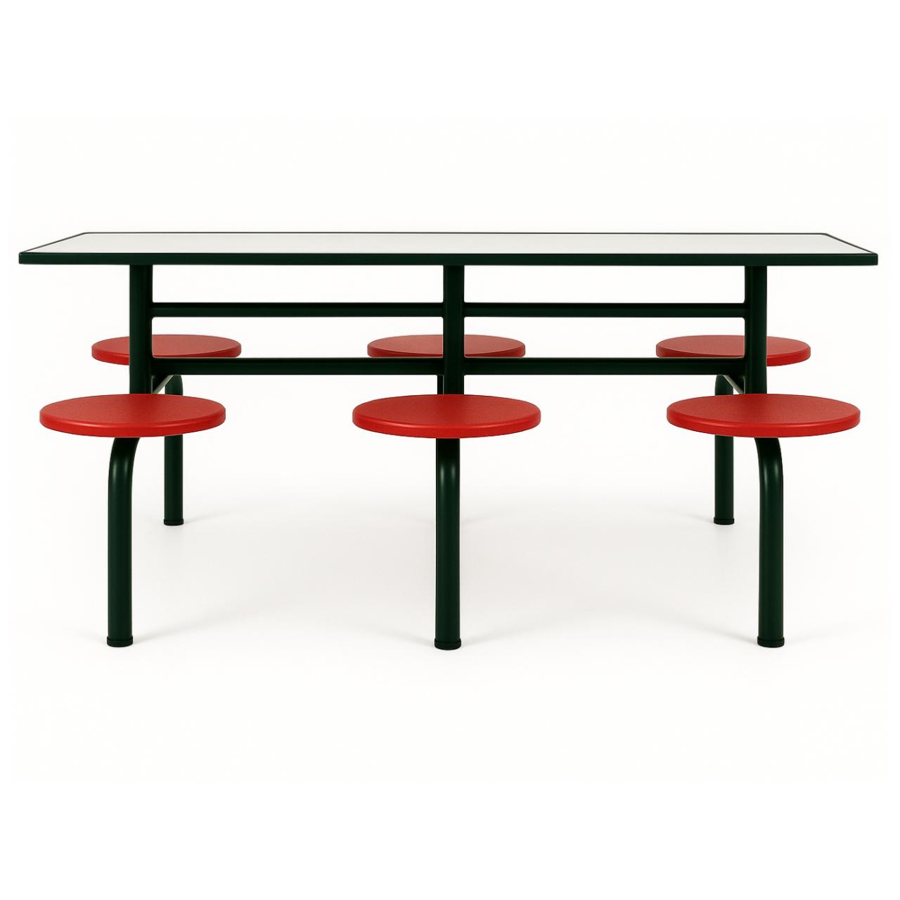 Mesa coletiva de refeitório com bancos fixos integrados, ideal para uso em ambientes institucionais, industriais, escolares e corporativos. Estrutura metálica reforçada e assentos individuais acoplados garantem durabilidade, praticidade e organização do espaço.