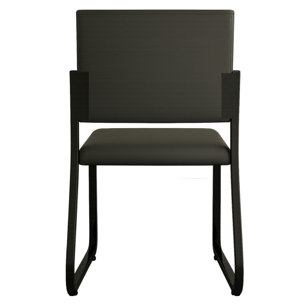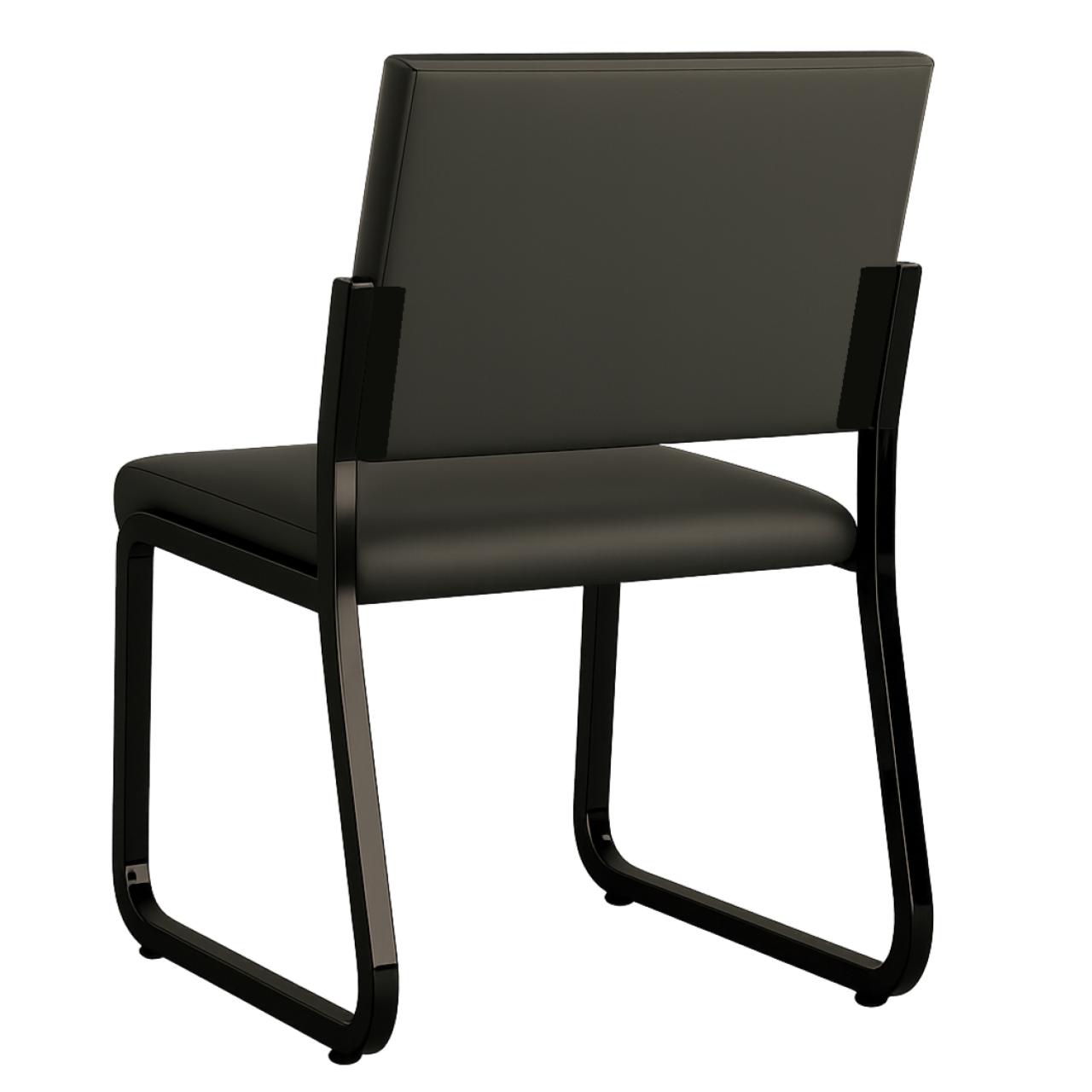 A cadeira apresenta design moderno e minimalista, ideal para ambientes corporativos, recepção, salas de reunião ou uso residencial sofisticado. O estofado com linhas horizontais no encosto confere elegância e leveza visual, além de transmitir uma sensação de organização e sofisticação.